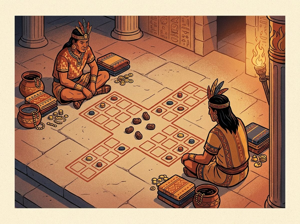 Cuando Hernán Cortés llegó al palacio de Moctezuma en 1519, una de las escenas que describió con mayor detalle en sus cartas a Carlos V no fue una ceremonia religiosa: fue una partida de Patolli. Dos nobles sentados frente a un tablero pintado en el suelo del patio, arrojando por turnos cinco frijoles manchados de negro contra una piedra, moviendo piezas por un circuito cruciforme, apostando mantas tejidas, granos de cacao, piezas de oro y —con frecuencia escandalosa para los españoles— su propia libertad personal. Era el juego nacional del Imperio Azteca. Treinta años después, la Corona española lo había prohibido bajo pena de destierro.