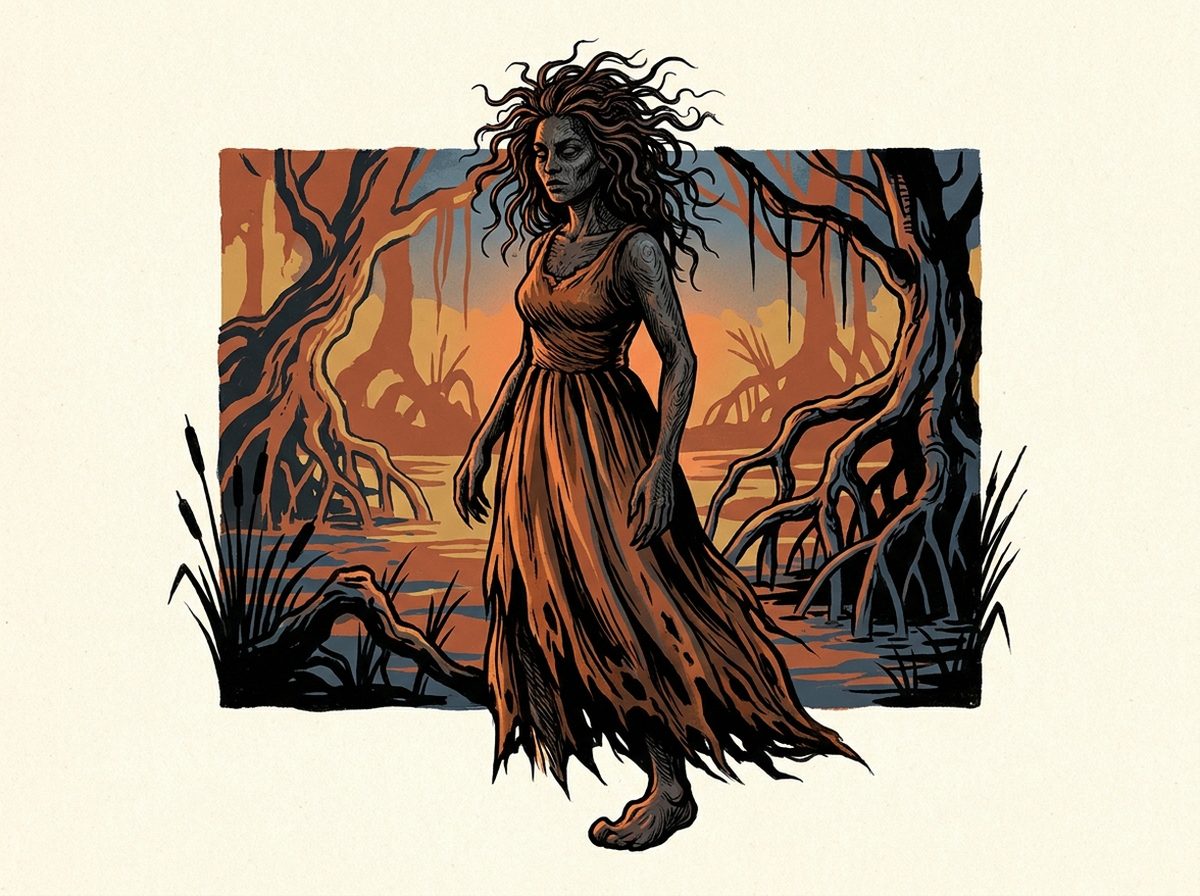 La Tunda es la legend-forma más característica del Pacífico afrocolombiano. Los pueblos de Chocó, Valle del Cauca, Cauca y Nariño —y del lado ecuatoriano, Esmeraldas— comparten un fondo cultural africano preservado por aislamiento geográfico durante cuatro siglos. La figura combina elementos del espíritu Mami Wata (divinidad acuática del oeste africano) con el motivo europeo de la bruja devoradora y con la representación criolla del miedo a la selva.